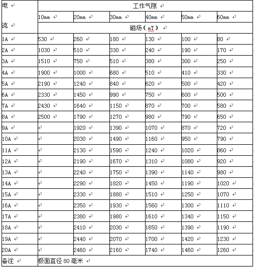 4.4 磁場(chǎng)強(qiáng)度:工作氣隙20mm時(shí),80mm極頭中心磁場(chǎng)最大H≥2.2T